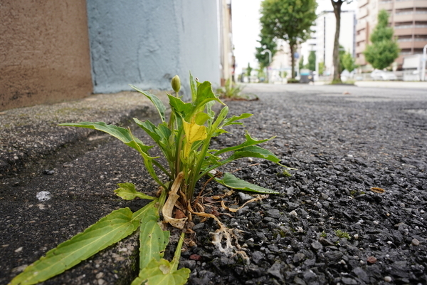 2022-09-03 スミレの閉鎖花 写真 今日は土曜だが出勤日。土曜の出勤は年に数回なのだが,2週間前の土曜も出勤日だった。今日はかなりが有給休暇をとるようだ。こういう日は,いつもとは違った仕事にじっくり取り組める。なので私は休みを取らず出勤を選ぶ。α7C+TAMRON24mmを持って出勤。人通りも少なく,気にせずにローアングルで写真が撮れる。 春に花を咲かせていたスミレ。そのときも写真を撮った。そのスミレがつぼみのようなものをよく付ける。開かない花,閉鎖花だ。自家受粉して種子をつくる。明け方まで雨が降っていた。そんな景色。