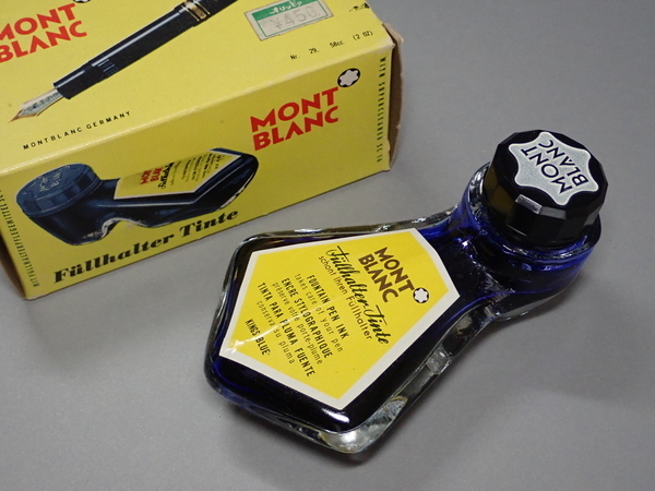 おまけに,40年以上前のモンブランのボトルインク。ペン先のデザインで,ふたの部分にインクをためることができ,吸い上げやすくなっている。いまはこんなヘンなものはつくらないかも。
